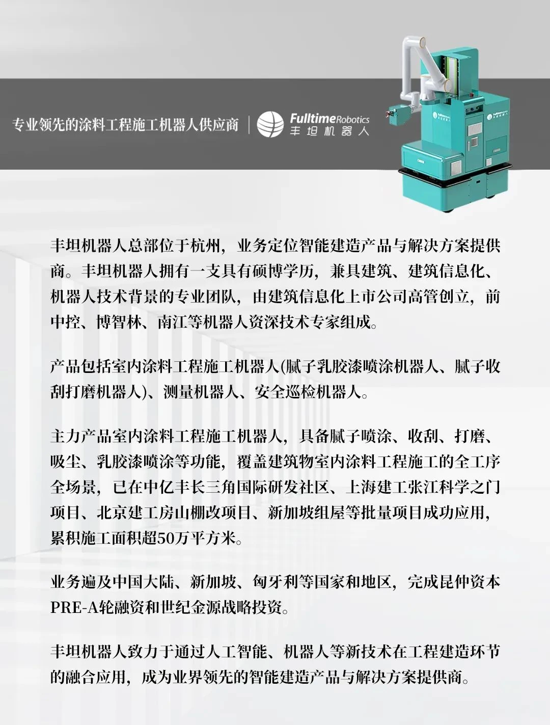 Founded in May 2022, Fulltime Robotics focuses on R&D, production, and sales of indoor coating engineering construction robots. Its products cover multiple construction links such as putty spraying, scraping, grinding, dust collection, and latex paint spraying, covering the full process and scenarios of indoor coating engineering construction. It has been successfully applied in batch projects such as Zhongyifeng Yangtze River Delta International R&D Community, Shanghai Construction Zhangjiang Science Gate Project, Beijing Construction Fangshan Shantytown Renovation Project, and Singapore HDB flats, with business expanded to multiple countries and regions including Singapore, Hungary, Hong Kong, and the UK.