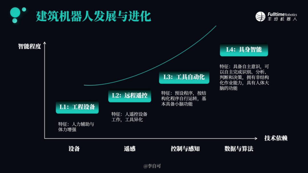李自可在报告中提出,当前建筑机器人的智能化发展已形成清晰的四级演进框架:从L1工程设备的人力辅助与体力增强,到L2远程遥控实现人控设备的工具异化,再到L3工具自动化依托预设程序具备基础“小脑”功能,最终迈向L4具身智能,具备自主处理非结构化作业的"大脑"能力。现阶段行业正处于L3向L4迈进的关键爬坡期,技术支撑从以硬件控制与传感器感知为主,向依托数据积累与算法优化的软件驱动模式加速演进,这一趋势对核电、能源建设等高安全标准场景尤为关键。