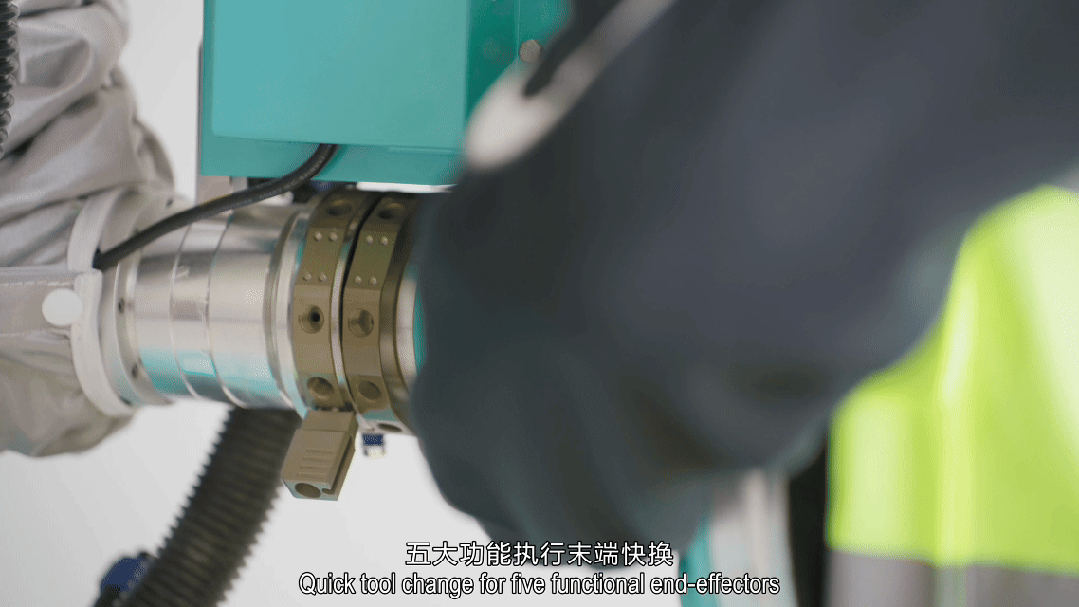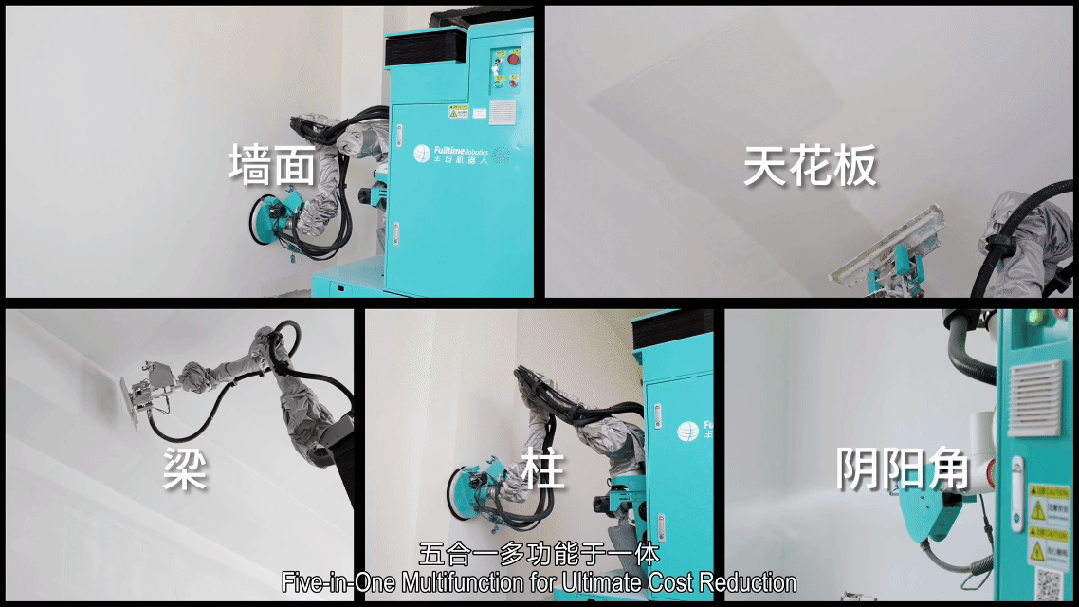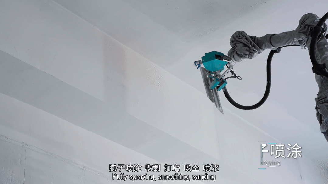 执行器控制力度精度±1N、位置精度0.1mm、速度精度误差率0.5%,腻子收刮平整度稳定在0.5mm以内。多模态集成执行器加执行末端,实现腻子喷涂、收刮、打磨、吸尘、喷漆五大功能;通过标准化接口整合于同一台机器人本体,5min完成快换执行末端;一机多用,相较于行业内采用2-3台独立机器人(如腻子、打磨、喷涂分机)完成多工序的方案,本产品可将客户采购成本降低超2/3,显著优化项目投入产出比。