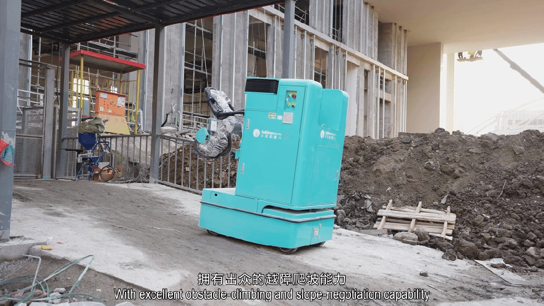 面向建筑工程施工场景的沟、坎、坡、积水、粉尘等复杂工况,产品采用自研四驱全向舵轮设计,越障高度50mm、爬坡能力10°、越沟宽度100mm,防护等级达IP54,可在高粉尘、高污染环境下长时间稳定运行。料箱升级至70L超大容量,按人工上料最舒适高度设计;自动回流清洗功能,让收工清洗时间大幅降低。