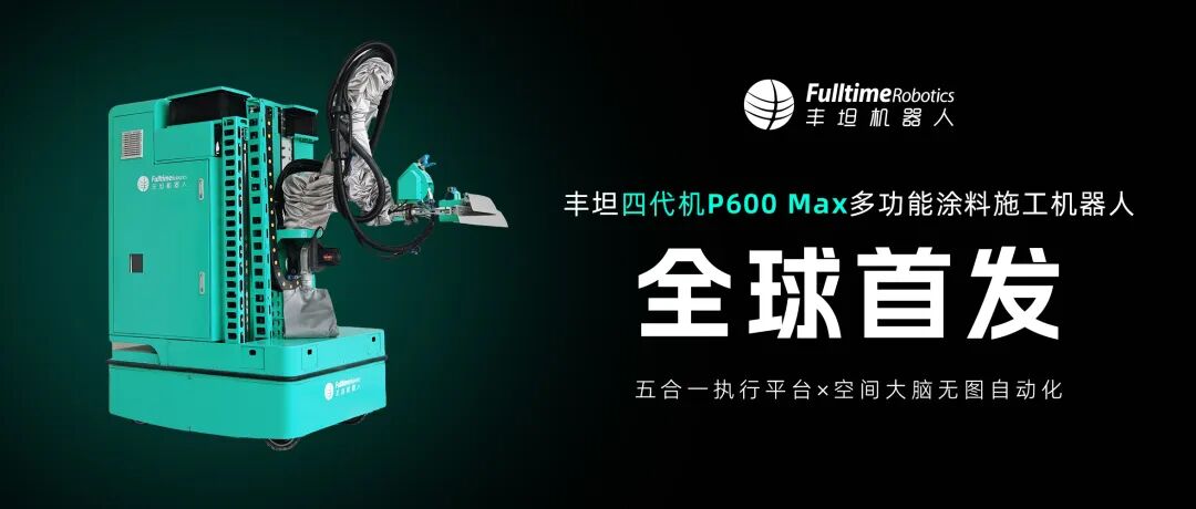 2026年4月,丰坦机器人(Fulltime Robotics)正式发布四代机P600 Max多功能涂料施工机器人。历时一年多研发,专为6米以下建筑涂料施工场景量身打造,首次以单机实现腻子喷涂、收刮、打磨、吸尘、喷漆五大工序全覆盖,配合自研“空间大脑”无图自动化施工技术,从设备利用率到施工成本,刷新行业效率天花板。目前P600 Max已正式开放预订。